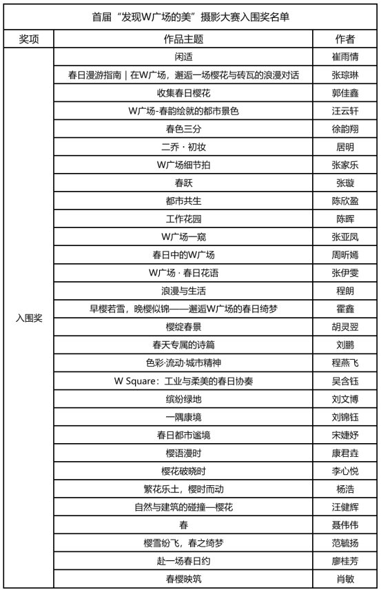 由W广场主办的首届“发现W广场的美”摄影大赛圆满落幕!自开赛以来,我们收到了众多记录W广场建筑韵律、人文温度与春日浪漫的精彩作品。经过摄影协会及高校专家评审团严谨公正的评选,获奖名单及作品今日正式公布!